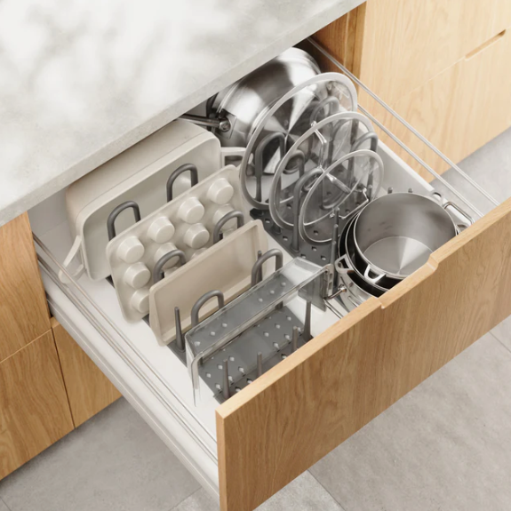 - Ruokakomero / keittiö: Lankahyllyt ovat ihanteellisia - se mahdollistaa ilmankierron ja tekee roiskeista helppo puhdistaa. Lisää hyllytaskuja pienille tavaroille.